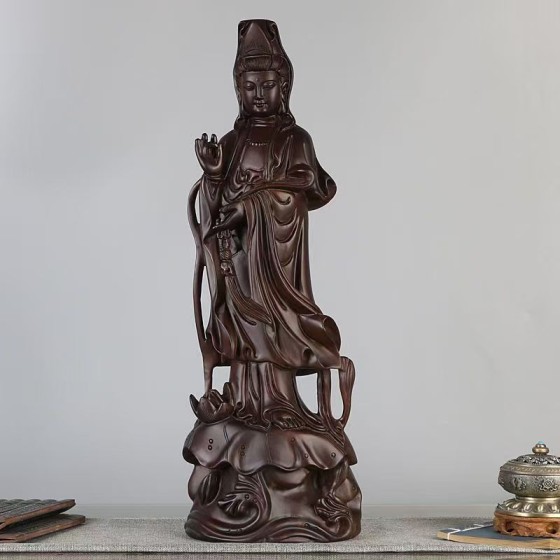 Large - sized Ebony - carved Guanyin Statue with Ruyi Decoration, Made of Solid Wood