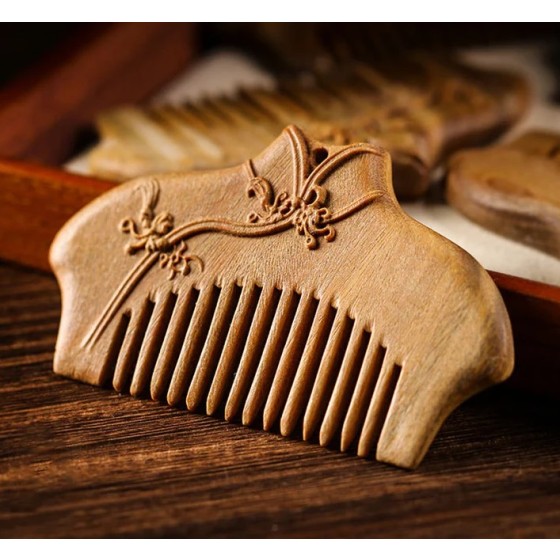 Buddha Stones Green Sandalwood Flower Pattern Engraved Soothing Comb