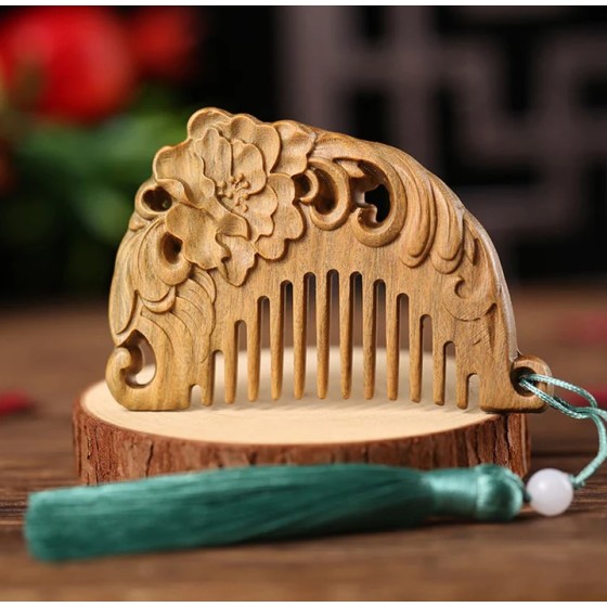 Buddha Stone Green Sandalwood Comb with Engravings of Fox, Peony, Lotus and Healing Tassels