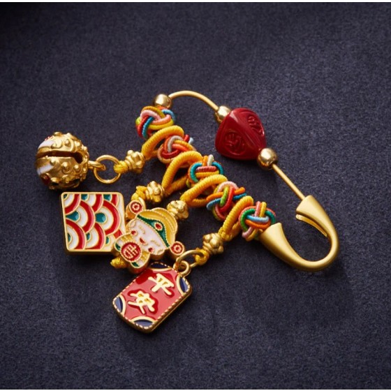 Buddha statue stones, cinnabar, zongzi (sticky rice dumplings), Chinese character "Fu" (meaning good fortune), and statues of the God of Wealth - used for praying for peace and good luck. Copper - made prayer brooches