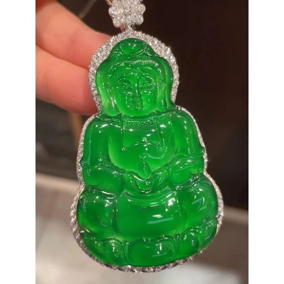 Buddha Stone Natural Type - A Jadeite, Ice - Type Jadeite with Full - bodied Bright Green Guanyin Wushi (No - Design) Pendant
