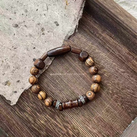 Natural Tiger - Skin Sandalwood Hand - strung Bracelet, Chinese Retro Style, Handmade Wooden Beads, Bamboo - joint Design, Retro Silver Ornaments, Unisex Style