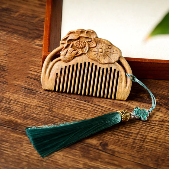 Buddha Stone Green Sandalwood Comb with Engravings of Fox, Peony, Lotus and Healing Tassels